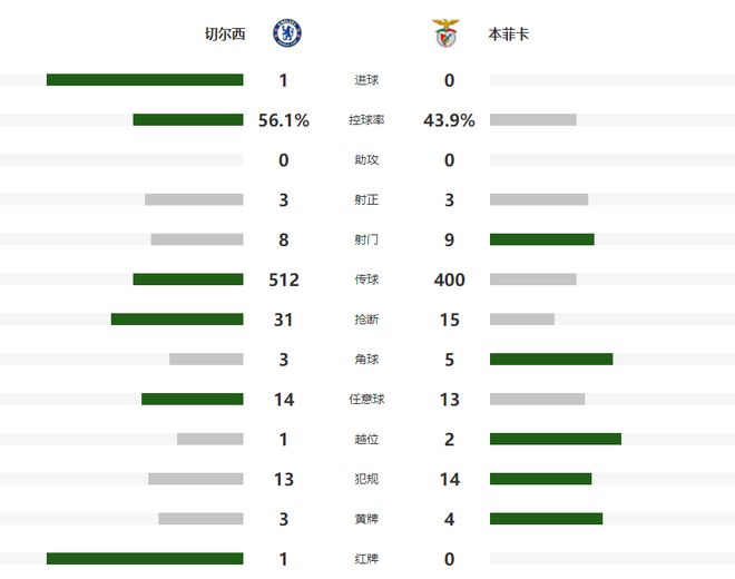 易边再战,加纳乔在第59分钟长途奔袭,但是临门一脚缺乏准度,一脚将皮球踢飞,没有给本菲卡的球门造成实质性的威胁,第73分钟内托禁区内头球攻门稍稍高出,6分钟之后,埃斯特旺接到恩佐传中后,也完成了一记头球,不过被客队门将扑出。伤停补时阶段,替补登场的切尔西前锋佩德罗,因为抬脚过高,吃到了本场比赛的第二张黄牌,两黄变一红被主裁判罚下,好在时间所剩不多,蓝军也如愿在主场零封了本菲卡。