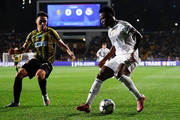 开场后皇马毫无身价碾压对面百倍的观感,甚至在开场前15分钟内,除了维尼修斯错失的一次单刀射门几乎毫无机会,反而是凯拉特借主场之势打出了几次射门。凯拉特能在欧冠资格赛附加赛两回合零封凯尔特人,证明该队的防守有一定水准。整个上半场,进攻线主力尽出的皇马基本没制造出太多破门机会,如果不是凯拉特门将扑倒马斯坦托诺送点,皇马怕是很难在中场休息前打开僵局。下半场姆巴佩接库尔图瓦后场长传,仰仗速度杀入禁区破门,为皇马扩大比分。虽然胜局无忧,但相比同一天客场面对帕福斯半场打入4球的拜仁,以及主场碾压法兰克福半场3球遥遥领先的马竞,皇马仅靠一粒点球和一次快速反击才两球领先欧冠新军凯拉特,多少有些说不过去。何况在场面上,皇马也并没有完全压制住对手,楚阿梅尼和塞瓦略斯的中场组合多次轻易被对手断下球权,后者下半场禁区内一次不必要的出脚动作差点被判极刑,幸好在VAR的介入下点球被取消。