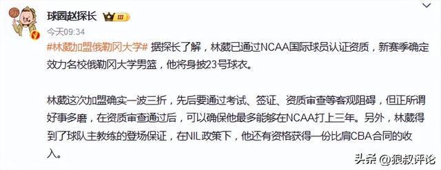 媒体人赵探长发文点评说道:林葳这次加盟确实一波三折,先后要通过考试、签证、资质审查等客观阻碍,但正所谓好事多磨,在资质审查通过后,可以确保他最多能够在NCAA打上三年。另外,林葳得到了球队主教练的登场保证,在NIL政策下,他还有资格获得一份比肩CBA合同的收入。更重要的是,林葳和他的团队也将创造历史,成为了第一个以职业身份打上NCAA的中国球员。祝福葳子,追梦一切顺利。NIL合同是签约品牌将拥有这些学生的Names(名字)、Images(形象)、Likenesses(肖像)的使用权。NCAA这些年有NIL政策之后,很多运动员场外拿了很多代言,像林葳这样的中国球员走出去,也一定会有不少赞助支持。希望林葳能够通过个人表现,有朝一日重新代表国家队出征国际大赛。