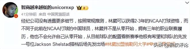 媒体人王健发文点评:经纪公司没有透露更多细节,按照常规推测,林葳可以获得2-3年的NCAA打球资格,而不同于此前在NCAA打球的中国球员,林葳并不是从零开始,拥有三年的职业联赛履历,他也不会允许自己从零开始,从目前球队的配置看新赛季他极有希望和球队的先发一号位Jackson Shelstad搭档后场先发出场媒体人海jun的蓝发文说道:“林葳的经纪公司终于官宣了,这样的话应该就不会耽误新赛季的赛程了,其实对比过往其他国家的职业球员加盟NCAA这个速度算是挺快了,很期待林葳下赛季的NCAA表现,希望俄勒冈大学能成为他冲击