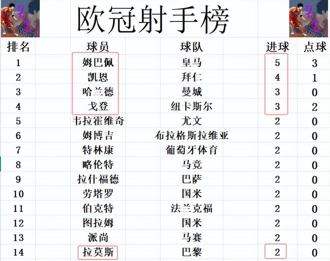 射手榜方面,姆巴佩5球领跑,凯恩4球排在第2。哈兰德今天梅开二度,戈登点射双响,两人3球升至第3。拉莫斯打入绝杀球,追上劳塔罗,拉什福德,韦拉霍维奇等人2球刚好挤入前十。以上内容请关注首页JRS