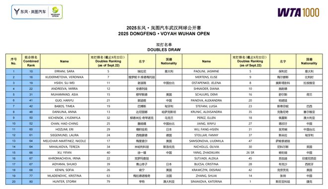 此外,雅加达亚运会金牌得主徐一璠/杨钊煊、海峡组合蒋欣玗/詹皓晴也将参赛,为本届武网女双赛事增添更多亮点。