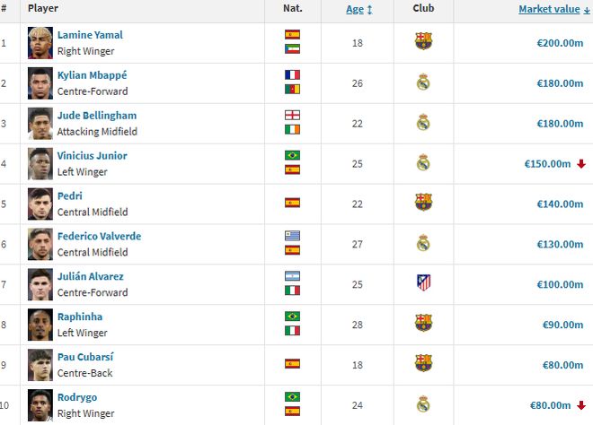 - 西甲 | 西甲球员最新身价:亚马尔2亿欧居首,,维尼修斯跌至1.5亿欧
