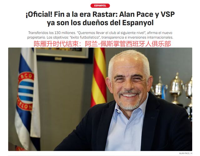 西班牙人的中资时代,正式结束。北京时间10月9日,西甲俱乐部西班牙人官方宣布,阿兰-佩斯的ALK资本旗下体育投资部门VSP,完成对西班牙人俱乐部股权的收购。陈雁升以1.3亿欧元的价格出售西班牙人俱乐部,其中6500万欧元(折合人民币5.4亿元)的现金支付已经到账。