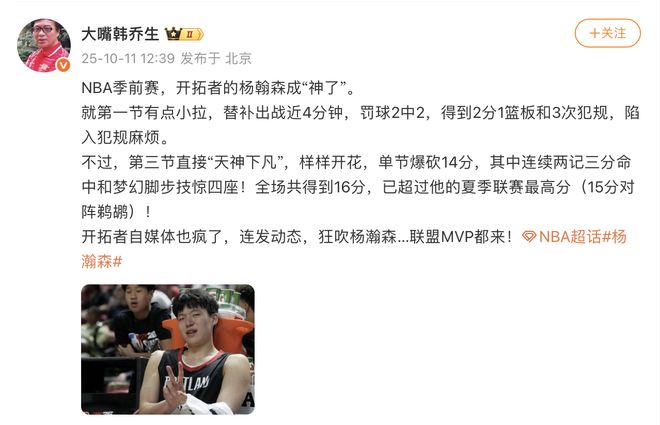 - NBA | NBA祝贺、主帅赞不绝口,杨瀚森单节得14分,外媒:他正统治比赛