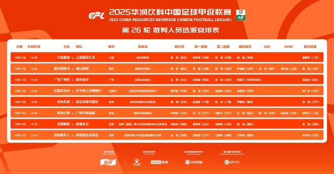 - 中超 | 中甲26轮裁判选派:2场关键战启用VAR,多名中超裁判执哨!