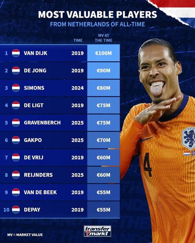 德转统计荷兰球员历史身价榜:1. 范戴克(2019年) 1亿欧元2. 弗朗基-德容(2019年) 9000万欧元3. 哈维-西蒙斯(2024年) 8000万欧元4. 德利赫特(2019年) 7500万欧元5. 赫拉芬贝赫(2025年) 7500万欧元6. 加克波(2025年) 7000万欧元7. 德弗赖(2019年) 6000万欧元8. 赖因德斯(2025年) 6000万欧元9. 范德贝克(2019年) 5500万欧元10. 德佩(2019年) 5500万欧元【上咪咕独家看英超】以上内容请关注首页JRS