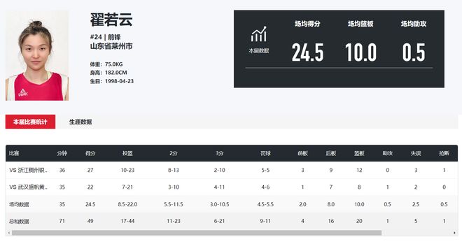 当然山西的基本盘还是翟若云,首战浙江女篮是27分12篮板1抢断,此役是22分8篮板,两场比赛合计拿到49分20篮板,场均24.5分10篮板0.5助攻,命中率38.6%,三分命中率28.5%,她在国内联赛就是被包夹的水准。