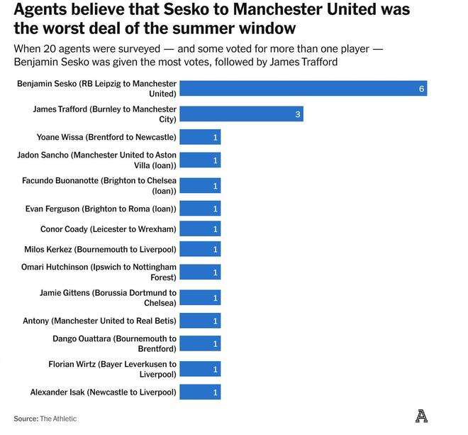 特拉福德在 7 月结束与伯恩利的两个赛季后重返曼城,替代埃德森,但在多纳鲁马压哨加盟后沦为第二选择,他被三位经纪人列为今夏最差交易。“我只是觉得这是个错误的决定,”一位经纪人说。“特拉福德本可以在伯恩利每周都上场,或者他本可以去纽卡斯尔并在那里每周踢球。相反,他现在坐在曼城的替补席上,而且他排在世界上最好的守门员后面。”对特拉福德职业生涯不利的交易也被视为对曼城不利。“花了很多钱买一个门将,几周后又找人替代他?”另一位经纪人质疑道。然而,最终,谢什科从 RB 莱比锡以 7360 万英镑(含附加条款)转会至曼联受到了最多的批评。“钱花得太多了,而且为时过早,”一位经纪人说。“他们是被迫做出这笔签约的,”另一位声称。“对于没有太多履历的球员来说,这是一大笔钱,”第三位经纪人这样认为。其他被点名的交易包括比诺埃-吉滕斯从多特蒙德到切尔西(“对他来说完全是错误的俱乐部”)、丹戈-瓦塔拉从伯恩茅斯到布伦特福德(“为无法填补他们出售球员所留下空缺的人支付 4200 万英镑,这散发着绝望的气息”)、维萨从布伦特福德到纽卡斯尔(“为一名 29 岁且在引援偏好名单上排名靠后的球员花这么多钱”),以及那位似乎是足球界评价两极分化的人物——哲凯赖什(“英超关乎速度和敏捷,我不确定他具备这些“)。此外,伊萨克以 1.25 亿英镑转会安菲尔德也受到了审视。“既因为利物浦为他支付的费用,也因为俱乐部的文化,”一位经纪人说。“纽卡斯尔主帅埃迪-豪是个好人,他尽可能有尊严地处理了这件事。对我来说,伊萨克的行为方式背离了利物浦的核心原则——在利物浦,一直以来都是俱乐部高于个人。”【上咪咕独家看英超】以上内容请关注首页JRS