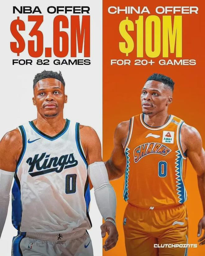 前一阵子,威少爷传出了去海外联赛打球的消息,还有传闻称中国CBA联赛有球员愿意给出4倍于国王的报价。这简直是开玩笑,国王给的是360万美元左右的老将底薪合同,能有CBA球队愿意给1200万美元的合同?CBA是有外援工资帽的,4个外援加起来也就只有400多万美元。