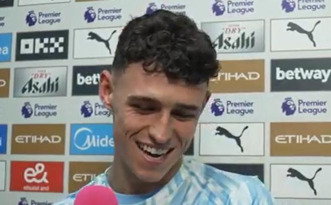 英超第8轮,曼城主场2-0埃弗顿,福登赛后接受了曼城官方采访。
