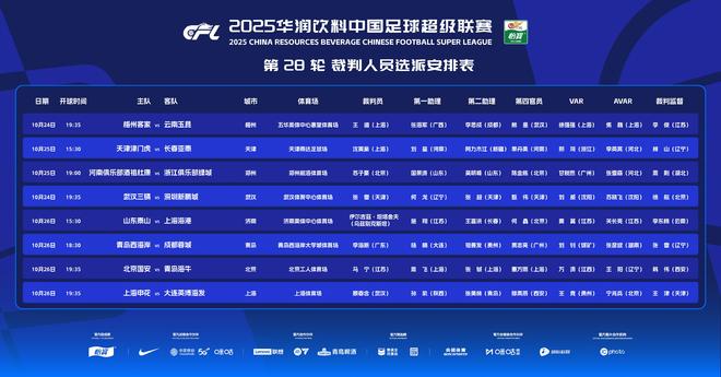 中超联赛第28轮裁判选派梅州客家vs云南玉昆 王迪(上海) 徐强强(上海)天津津门虎vs长春亚泰 沈寅豪(上海) 邢琦(浙江)河南vs浙江俱乐部 苏子豪(北京) 甘树然(广州)武汉三镇vs深圳新鹏城 张雷(天津) 刘威(沈阳)山东泰山vs上海海港 伊尔吉兹-坦塔舍夫(乌兹别克斯坦) 黄翼(江苏)青岛西海岸vs成都蓉城 李海新(广东) 刘钊(煤矿)北京国安vs青岛海牛 马宁(江苏) 万涛(江西)上海申花vs大连英博 顾春含(武汉) 王竞(贵州)以上内容请关注首页JRS