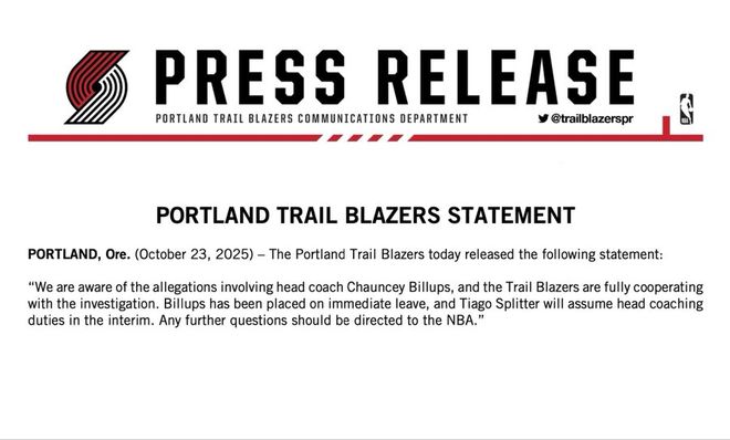 开拓者官方声明:即日起暂停比卢普斯职务,斯普利特任临时主帅