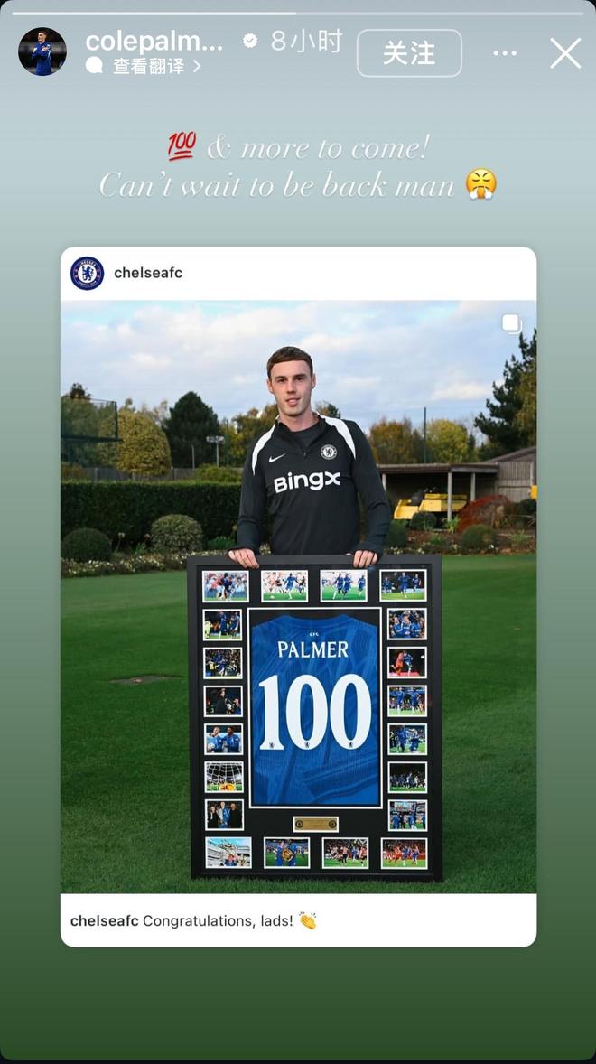 - 欧冠 | 里程碑!帕尔默社媒晒切尔西百场球衣,表示想早日回归