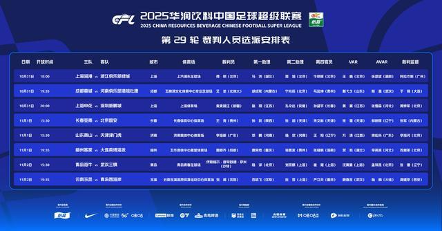 中超29轮裁判选派安排表上海海港vs浙江 傅明(北京) 王巍(北京)成都蓉城vs河南 艾堃(北体大) 戴弋戈(山东)上海申花vs深圳新鹏城 麦麦提江(新疆) 黄翼(江苏)长春亚泰vs北京国安 王竞(贵州) 张雷(天津)山东泰山vs天津津门虎 李海新(广东) 万涛(江西)梅州客家vs大连英博 唐顺齐(成都) 贺凯(湖北)青岛海牛vs武汉三镇 伊斯梅尔-穆罕默德-萨米(沙特) 沈寅豪(上海)云南玉昆vs青岛西海岸 刘威(沈阳) 顾春含(武汉)以上内容请关注首页JRS