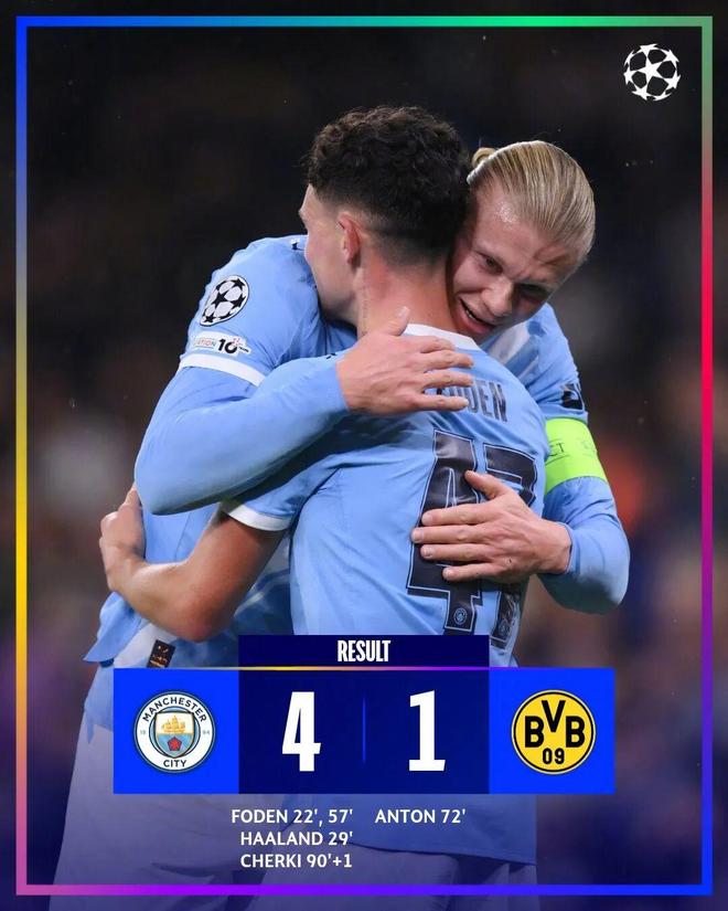 上半场福登远射破门,哈兰德爆射扩大领先。下半场福登梅开二度,安东扳回一球,谢尔基补时锁定胜局,莱因德斯贡献两次助攻。最终曼城4-1大胜多特,曼城4轮3胜1平不败,积10分暂居第4,多特7分第14。以上内容请关注首页JRS