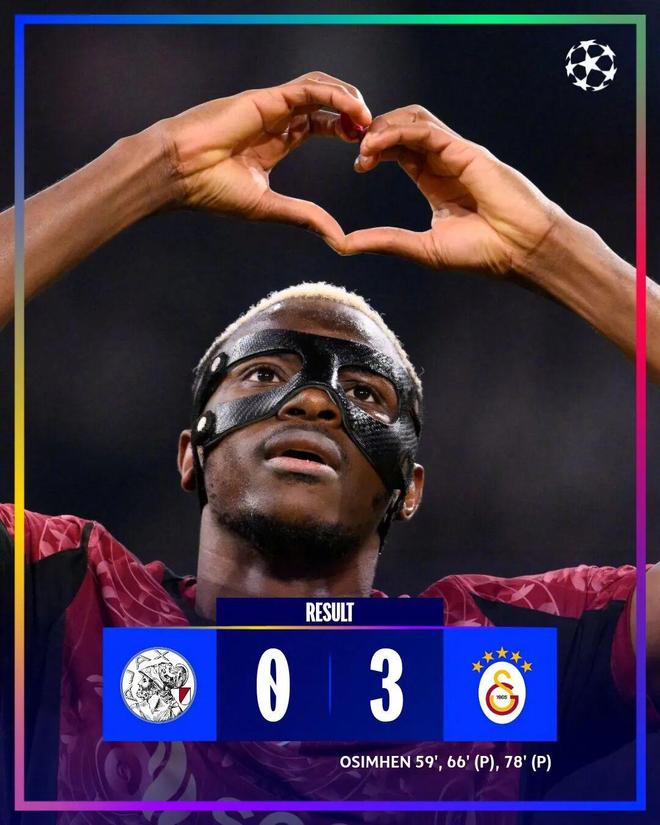 四届欧冠冠军得主被客场虫狂虐,奥斯梅恩大演帽子戏法,帮助加拉塔萨雷3-0大胜阿贾克斯。阿贾克斯开赛至今4战4负,打进1球狂丢14球,积分榜垫底。下一轮,阿贾克斯将和本菲卡狭路相逢,两支开局四连败球队将迎来直接对话。就看看是穆里尼奥和海廷加能否解锁积分账户。曼城4-1多特蒙德