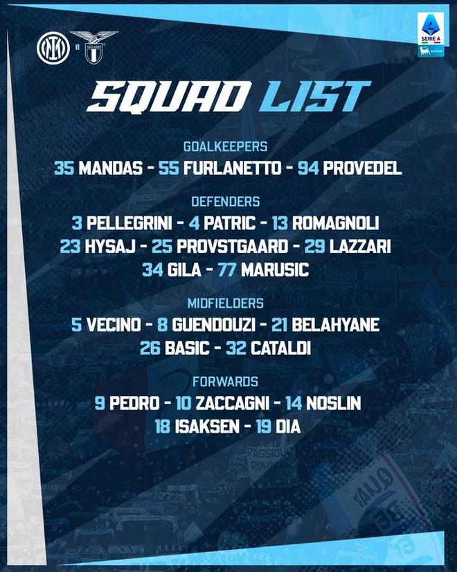 - 意甲 | 拉齐奥公布战国米名单:扎卡尼、佩德罗在列,6名球员缺阵