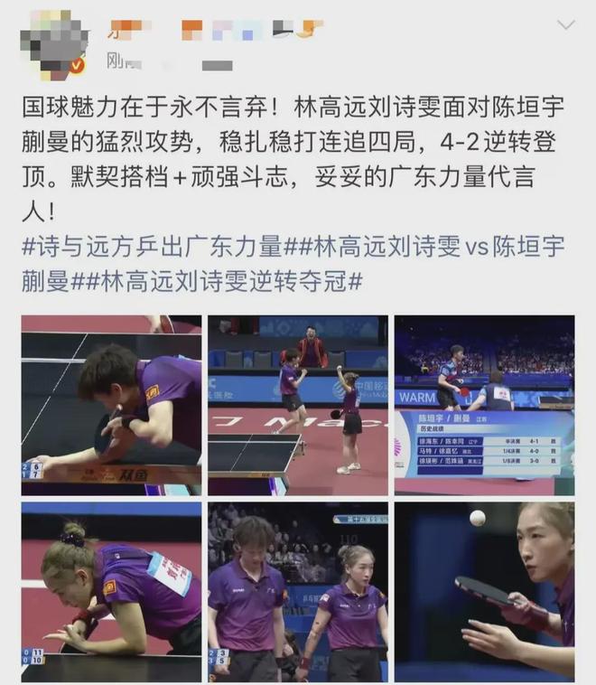 在14日晚结束的混双决赛中,广东队组合林高远/刘诗雯以4:2(局分:13-15、8-11、11-8、11-8、11-8、12-10)战胜江苏队组合陈垣宇/蒯曼,夺得冠军!