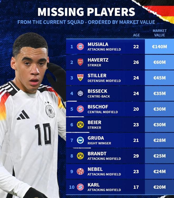- 英超 | 此次未入选德国队大名单身价前10:穆西亚拉领衔,哈弗茨在列