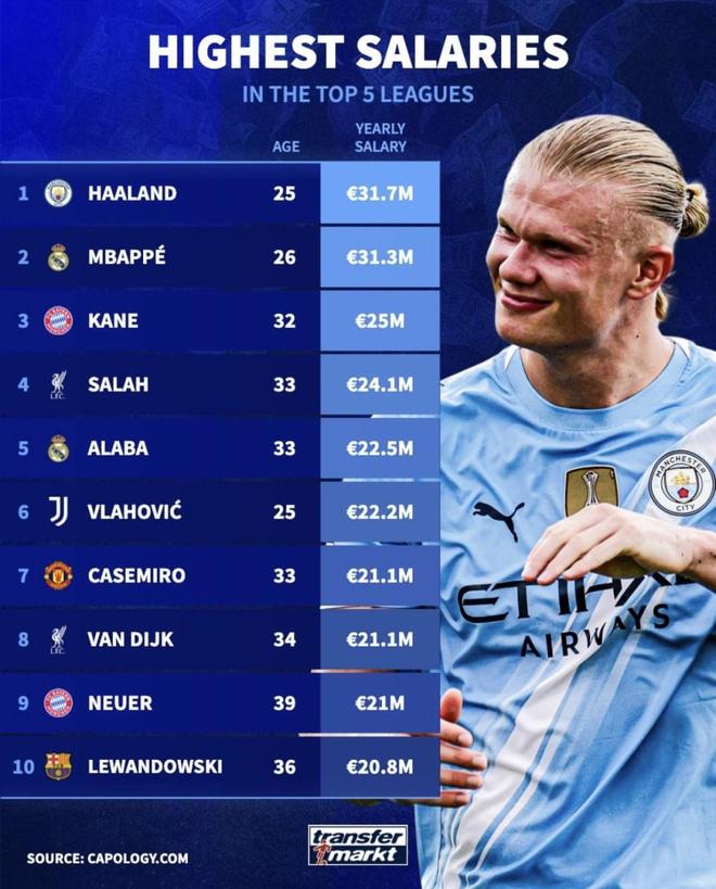 具体榜单1)哈兰德(Haaland)国籍:挪威俱乐部:曼城年龄:25年薪:3170万欧元 | 约2.61亿元人民币