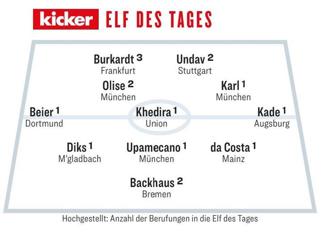 守门员:巴克豪斯(不莱梅)后卫:迪克斯(门兴)、于帕梅卡诺(拜仁)、丹尼-达科斯塔(美因茨)中场:拜尔(多特)、拉尼-赫迪拉(柏林联合)、安东-卡德(奥格斯堡)、奥利塞(拜仁)、伦纳特-卡尔(拜仁)前锋:伯卡特(法兰克福)、昂达夫(斯图加特)以上内容请关注首页JRS