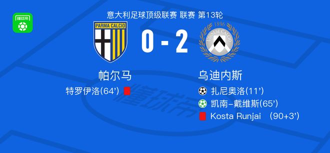 北京时间11月29日,意大利足球顶级联赛第13轮,帕尔马主场迎战乌迪内斯。比赛中,贝尔托拉送出助攻,扎尼奥洛接球后冷静施射破门,为乌迪内斯取得领先。随后,帕尔马球员特罗伊洛因犯规被直接罚下,球队陷入人数劣势。紧接着,乌迪内斯获得点球机会,凯南-戴维斯主罚命中,将比分扩大。比赛临近结束前,乌迪内斯教练组成员Kosta Runjaić因不当行为被出示红牌。最终,乌迪内斯客场以2比0战胜帕尔马。精彩瞬间第11分钟,乌迪内斯球员贝尔托拉助攻扎尼奥洛打入一球。第64分钟,帕尔马球队特罗伊洛吃到红牌。第65分钟,乌迪内斯球员凯南-戴维斯罚入点球。下半场补时第3分钟,乌迪内斯球队Kosta Runjaić吃到红牌。球队阵容