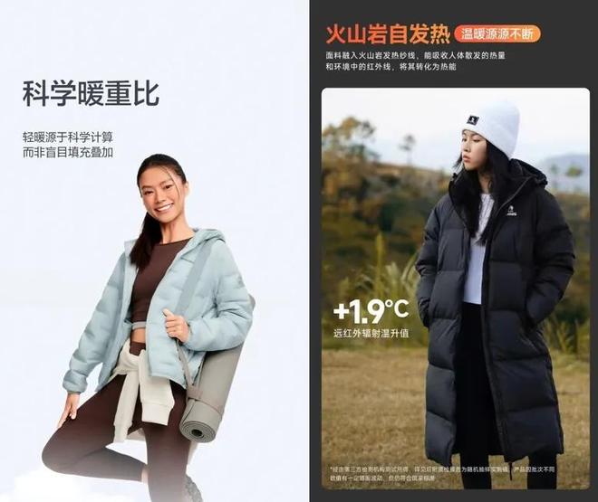 比如波司登今冬主打产品之一“云感鹅绒”系列,就强调“科学暖重比”概念:充绒量与衣服重量为0.2:1,达到轻、暖平衡效果。此外,各种太空科技、极地锁温技术也开始让位于更贴合实际需求的“微创新技术”,如骆驼“火神”系列羽绒服借助火山岩发热纱线,收集环境中的红外线转化为热能,达到较好的热能锁温效果。