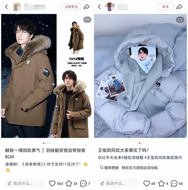 一众老牌国货品牌都遵循了这个做法:骆驼同时签下王俊凯、迪丽热巴,鸭鸭不久前续签了王一博,雪中飞签下了成毅。品牌结合明星个人特质,推出各种“明星同款”,在社交平台制造话题,向粉丝种草:如鸭鸭围绕王一博的运动形象,主推运动时尚款,走轻户外路线;骆驼则挖掘王俊凯身上的少年感,走青春、时尚路线。