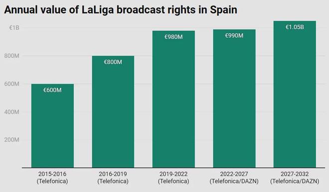 今年西甲迎来近24年最激烈争冠开局图源:西甲更让特瓦斯们欣喜的消息来自场外。近日,西甲联盟官宣完成2027-28至2031-32周期的西甲国内版权招标,西班牙电信(Telefónica)与 DAZN 两家平台完成续约,总价高达52.5亿欧元,对比上一周期(2022-23至2026-27周期)的49.5亿欧元上涨6%。如果算上西乙和商业场所、免费及赛事集锦三大板块,西甲联盟国内视听版权总收入更是达到61.35亿欧元,对比上一周期录得9%的增长。
