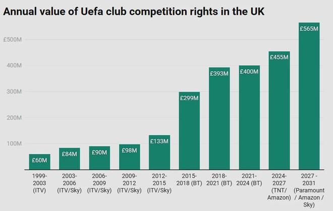 版权交易天价频出流媒体改变体育赛事版权格局实际上,近年来体育赛事版权交易开出天价早已不是新鲜事,流媒体平台成为掀起这场版权大战的主要玩家。不久前,北美娱乐巨头派拉蒙以超10亿英镑天价,取代TNT体育成为欧冠在英国及爱尔兰的独家持权转播机构,此前德国地区的版权早已落入派拉蒙手中。亚马逊旗下的Prime Video则拥有英国、爱尔兰、德国、意大利四地的欧冠周二晚场赛事首选转播权,而西班牙电信也以14.64亿欧元锁定了2027-2031年欧冠在西班牙的版权。由此,2027-2031周期的欧冠在欧美主流地区的版权即被派拉蒙+(美国、英国、爱尔兰、德国)和Prime两大流媒体平台瓜分,天空体育(意大利版权)、Canal+(法国版权)和西班牙电信(西班牙版权)则维持着传统电视平台在欧冠版权的一席之地。