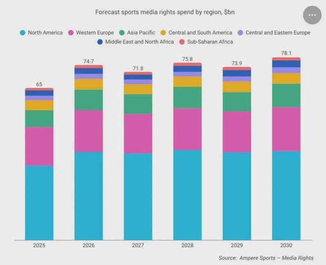 NBA版权支付27亿美元,而2029年MLB也将开启新的转播周期,苹果预期将加入争夺新周期MLB的流媒体版权,涨价几乎板上钉钉。此外,普遍被认为价值低估的NFL在2026年也有望开启新周期版权谈判,达成一份更高价值的转播协议也是市场预期的结果。Ampere在报告中预测,北美将从2025年的318亿增长至2030年的380亿美元,占据全球总预计增幅的47.7%。相比于北美市场的扩张,欧洲的增长预期则相对稳定,到2030年只增长30亿美元到213亿美元。尽管头部赛事如欧冠、世界杯、冬奥会等依然受到热捧,但欧洲转播机构在财力和竞价意愿上显然不如北美同行,加上中小联赛版权遇冷的现状依然持续,欧洲市场在体育版权上的增长幅度有限。值得注意的是,Ampere预测亚洲版权市场将从2025年的72亿美元提升到2030年的99亿美元。印度板球联赛在2027年将迎来新的转播周期,T20世界杯等国际板球理事会旗下赛事也有望将成为亚洲体育版权费用增长的新驱动力。