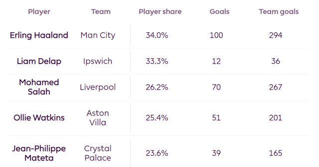 ③哈兰德客场进球能力很强,除安菲尔德之外,他在英超去过的每座球场都留下过进球。④哈兰德已经创造过英超单季进球纪录,处子季(2022-23)就砍下36球,打破了希勒和安迪·科尔共同保持的34球纪录。而且,哈兰德是35场打进36球,两位英格兰前辈则是在单季42轮时代创下的纪录。⑤哈兰德加盟以来,曼城在英超一共打进294球,哈兰德贡献了其中34%,这个占比为同期英超之最,只有德拉普在伊普斯维奇的贡献与此接近,萨拉赫在利物浦总进球中的占比“只有”26.2%。