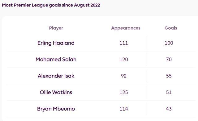 今年初,哈兰德与曼城续约9年半,如果这真的意味着他决心与蓝月长相守,那么,他打破并大大刷新纪录自然只是时间问题。倘若履行完2034年到期的合同,英媒测算他一共将收获389粒英超进球。英超官网罗列了诸多与哈兰德有关的数据:①2022年登陆英超以来,哈兰德进了100球,同期离他最近的萨拉赫只有70球,伊萨克55球就差得更远。
