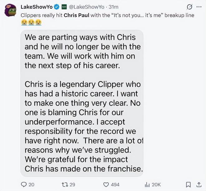 - NBA | 背锅侠找到了快船官宣解约保罗,后者也是今天才接到通知
