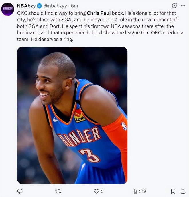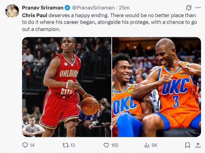 雷霆记者:保罗理应有一个圆满的结局。没有比他职业生涯起步的地方更适合他实现这一愿望的了,那就是与他的得意门生并肩作战,并有机会以冠军的身份退役。
