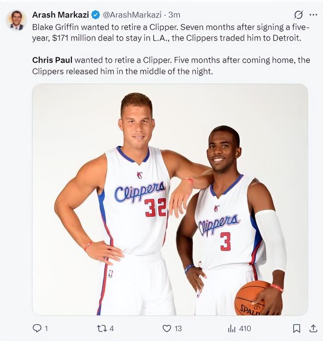 快船记者Arash Markazi写道:格里芬本想在快船结束职业生涯,他与快船签下五年1.7亿,但快船短短七个月就将他送到了底特律。保罗原本也想在快船退役,在回家五个月后快船就将他裁掉了。