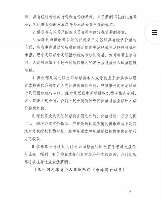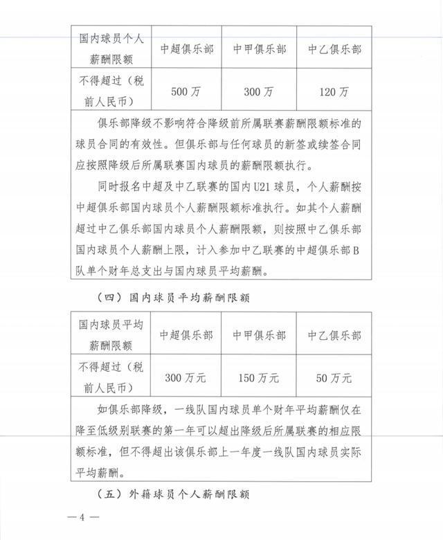 据足球报报道,12月3日下午,中足联发布《中国足球职业联赛俱乐部财务约定指标》,对职业俱乐部一线队球员薪资做出了详细规定:中超俱乐部国内球员个人薪酬不得超过500万元(税前),中甲国内球员个人薪酬不得超过300万元(税前),中乙国内球员个人薪酬不得超过120万。中超俱乐部外援个人薪酬不得超过300万欧元(税前),中甲俱乐部外援个人薪酬不得超过150万欧元(税前)。中超俱乐部外援薪酬总额不得超过1000万欧元(税前),中甲俱乐部外援薪酬总额不得超过400万欧元(税前)。中超俱乐部国内球员平均薪酬限额不得超过500万元(税前),中甲国内球员平均薪酬限额不得超过300万元(税前),中乙国内球员平均薪酬限额不得超过50万元(税前)。至于入籍球员,各俱乐部可自行选择本俱乐部的入籍球员按照国内球员或外籍球员标准执行相应的薪酬限额(包括球员个人薪酬限额、国内球员平均薪酬限额或外籍球员薪酬总额),并在中足联或中足联授权机构备案,如中超俱乐部选择本俱乐部的入籍球员按外籍球员标准执行薪酬限额,则外籍球员单个财年薪酬总额上限增加200万欧元,同时除入籍球员外的外籍球员薪酬总额不得超过(税前欧元)1.000万:中甲俱乐部选择本俱乐部的入籍球员按外籍球员标准执行薪酬限额,则外籍球员单个财年薪酬总额上限增加80万欧元,同时除入籍球员外的外籍球员薪酬总额不得超过(税前欧元)400万。