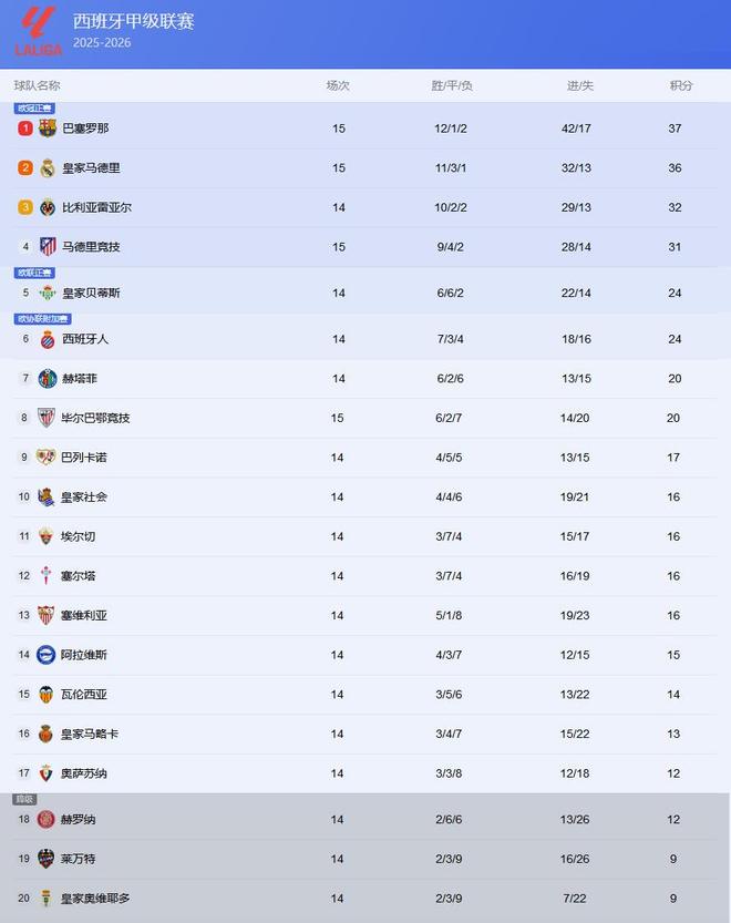 - 西甲 | 随着皇马30,巴萨31,西甲第19轮结束两场比赛,最新积分榜如下