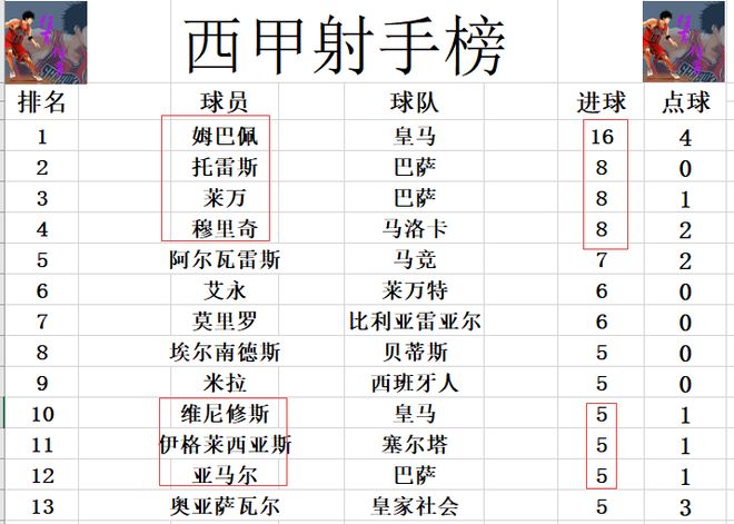 射手榜方面,姆巴佩今天2射1传独造3球,再次扩大了领先优势,进球数已经是排名第2的莱万,托雷斯,穆里奇等人的两倍。阿尔瓦雷斯7球排在第5,维尼修斯今天错失良机没有进球,还是和亚马尔,伊格莱西亚斯等人5球刚好挤入前十。以上内容请关注首页JRS