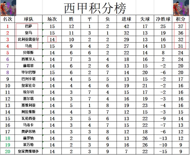 - 西甲 | 随着皇马30,巴萨31,西甲第19轮结束两场比赛,最新积分榜如下