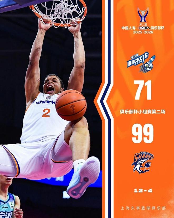 在第二届CBA俱乐部杯B组小组赛中,卫冕冠军上海久事男篮展现了强大实力。继首战以111比72大胜全华班出战的四川队后,该队在12月4日的第二轮比赛中背靠背出战,以99比71再胜宁波町渥队,强势收获两连胜。两场比赛,上海队男篮累计净胜对手高达67分,提前锁定B组上半区头名。面对实力存在差距的宁波队,上海队此役对首发阵容进行了调整,由怀特塞德与李添荣顶替了王哲林与弗格首发。比赛从一开始就呈现出一边倒态势,首节李弘权和李添荣迅速进入状态,外线接连发炮,帮助本队迅速建立优势。尽管洛夫顿和怀特塞德出手不多,但替补登场的外援古德温连拿7分状态出色,王哲林与弗格也在登场后均有得分进账,首节结束上海队以28比20领先。