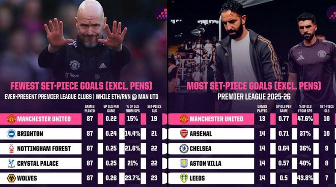 曼联13轮英超通过定位球打进10球,滕哈格时代87场仅有19球