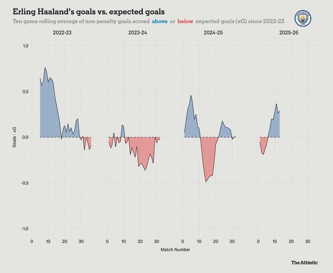从实际进球与预期进球的对比可以看到,哈兰德在来到曼城后的4个赛季里,第一个赛季进球效率最高,第二年出现了一定的滑坡,不过在本赛季又迎来新的强势反弹。更重要的是,本赛季的哈兰德可以无限扩大自己的活动范围,在攻防转换时串联一下球,随后用自己的无球移动引领反击队形,最后直接冲击禁区完成进球。除此之外,他甚至开发了背身拿球转身后直塞的技能,上一场助攻赖因德斯是最让球迷感到惊艳的时刻。