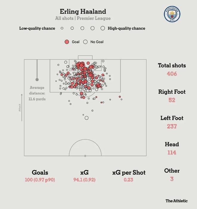 哈兰德的这100个进球一共用了406次射门,其中左脚射门237次(打入71球)、右脚射门52次(11球)、头球射门114次(打入17球)、其他部位射门3次(打入1球)。可以看到,哈兰德除了自己的左脚射门效率高的惊人之外(每3.33次射门进1球),他的逆足右脚和头球得分效率也是越来越高。尤其是头球技术的提升,让无数支持他的球迷欢欣鼓舞。