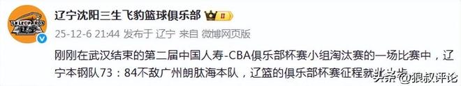 辽宁男篮官方赛后发文:刚刚在武汉结束的第二届中国人寿-CBA俱乐部杯赛小组淘汰赛的一场比赛中,辽宁本钢队73:84不敌广州朗肽海本队,辽篮的俱乐部杯赛征程就此止步。球迷对于这一支辽宁男篮即战力同样表达不满,特别是连续送走了弗格,张镇麟,郭艾伦等核心球员后,引进或者培养球员都很难达到短时间内挑大梁。