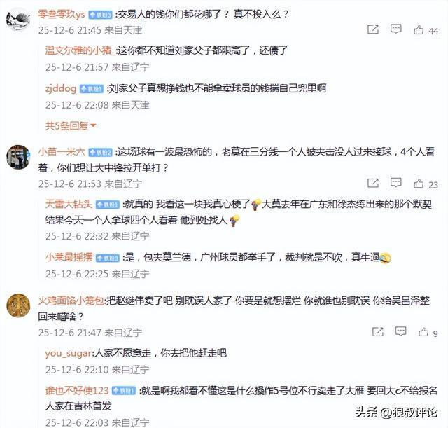 有球迷点评说道:“交易人的钱你们都花哪了? 真不投入么?”这场球有一波最恐怖的,老莫在三分线一个人被夹击没人过来接球,4个人看着,你们想让大中锋拉开单打?把赵继伟卖了吧 别耽误人家了 你要是就想摆烂 你就谁也别耽误 你给吴昌泽整回来噶啥?