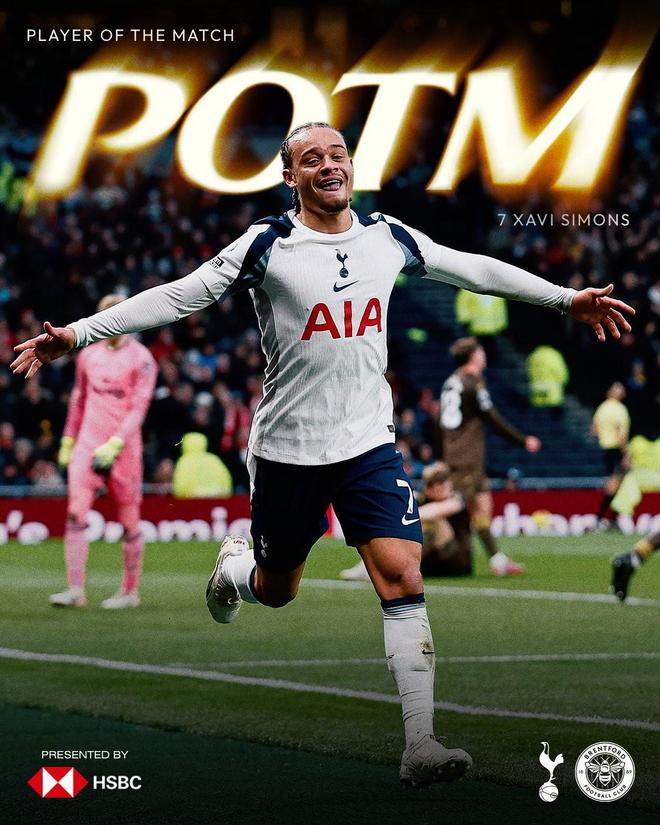 - 英超 | 1射1传,哈维西蒙斯当选热刺20布伦特福德一役队内最佳球员