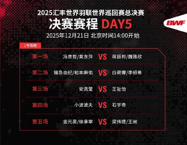 2025年世界羽联年终总决赛今日进入第5个比赛日,5个单项将决出年终冠军,中国队在混双、女单、男单、男双4项中闯入决赛,力拼4金。