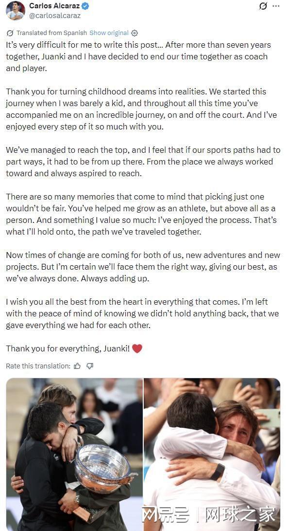 12月17日,世界第一阿尔卡拉斯在社交媒体上发布长文,宣布与陪伴自己七年多的教练费雷罗结束合作关系,整个网坛陷入了沉思。这不是一次普通的教练更替,而是一段师徒传奇的温柔谢幕。